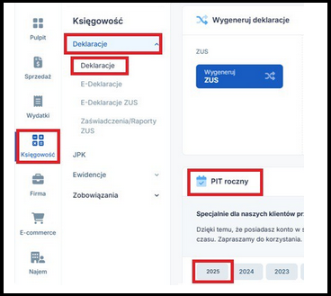 Aby rozliczyć zeznanie podatkowe PIT-28 za 2025 rok w serwisie IFIRMA należy przejść do zakładki Deklaracje ➡ Deklaracje i kliknąć w ikonę 2025.