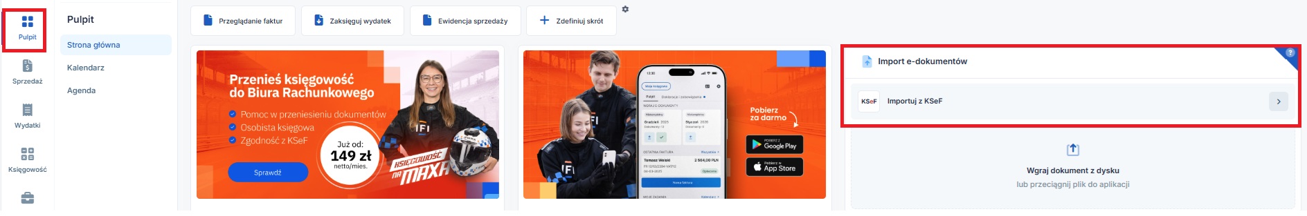 Funkcja importu dokumentów kosztowych dostępna jest z poziomu Pulpitu i części Import e-dokumentów
