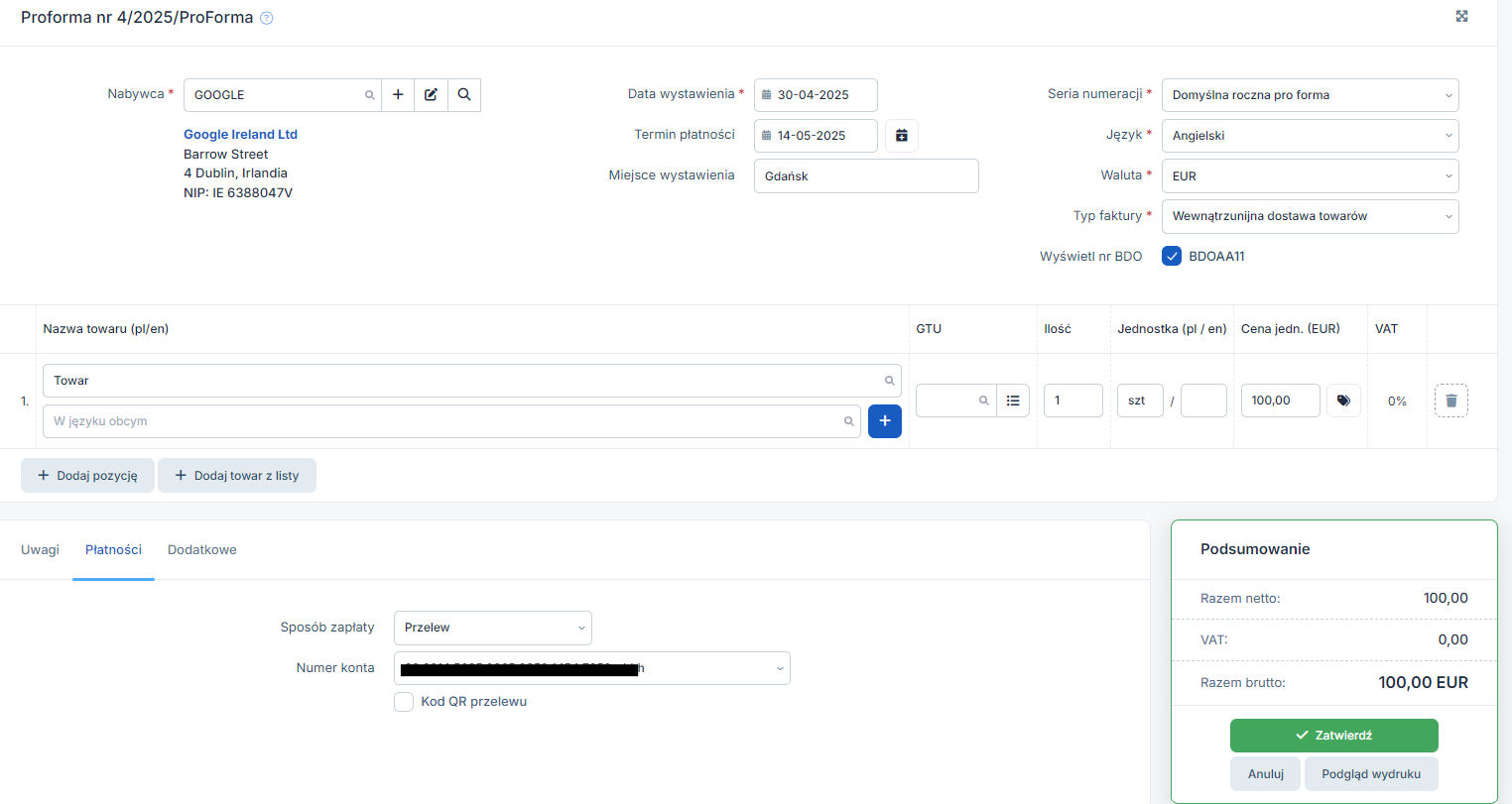 Na podstawie utworzonej faktury pro forma można wystawić fakturę sprzedaży na wewnątrzwspólnotową dostawę towarów (WDT).