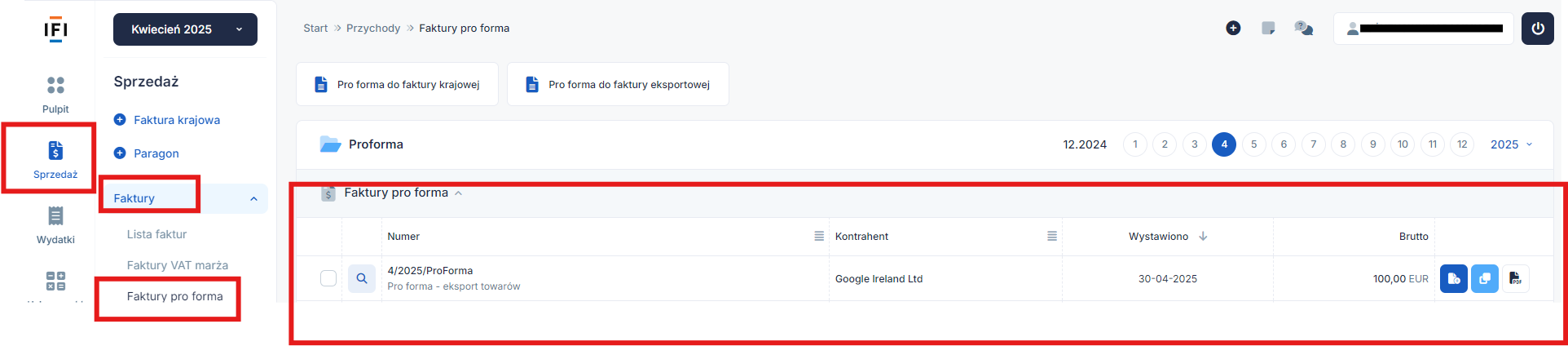 Zatwierdzona faktura pro forma jest dostępna w zakładce Sprzedaż ➡ Faktury ➡ Faktury pro forma.