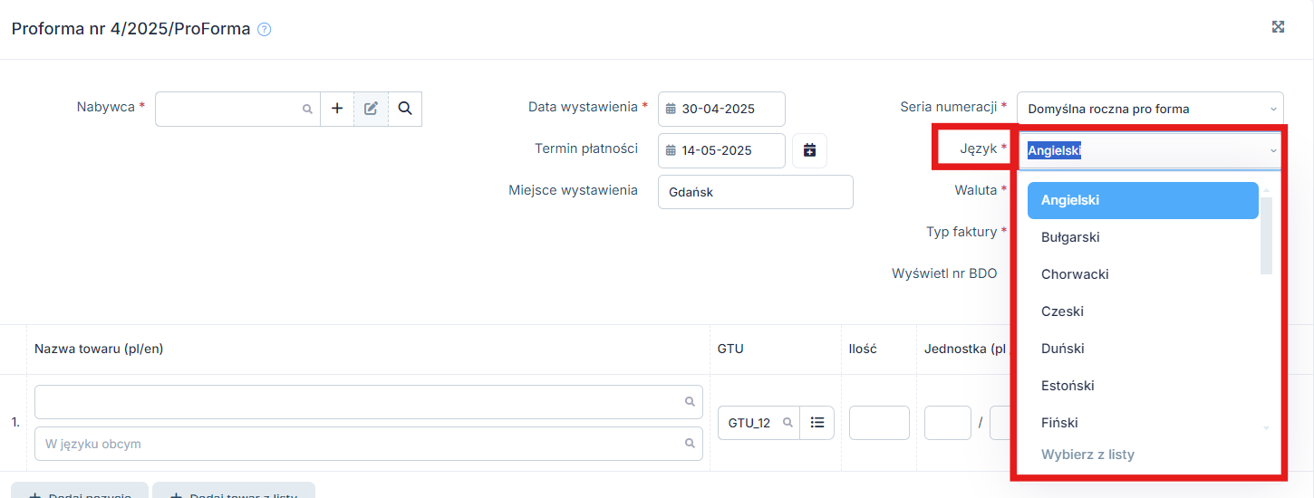 W formularzu faktury pro forma do faktury eksportowej wybieramy typ faktury Wewnątrzunijna dostawa towarów.