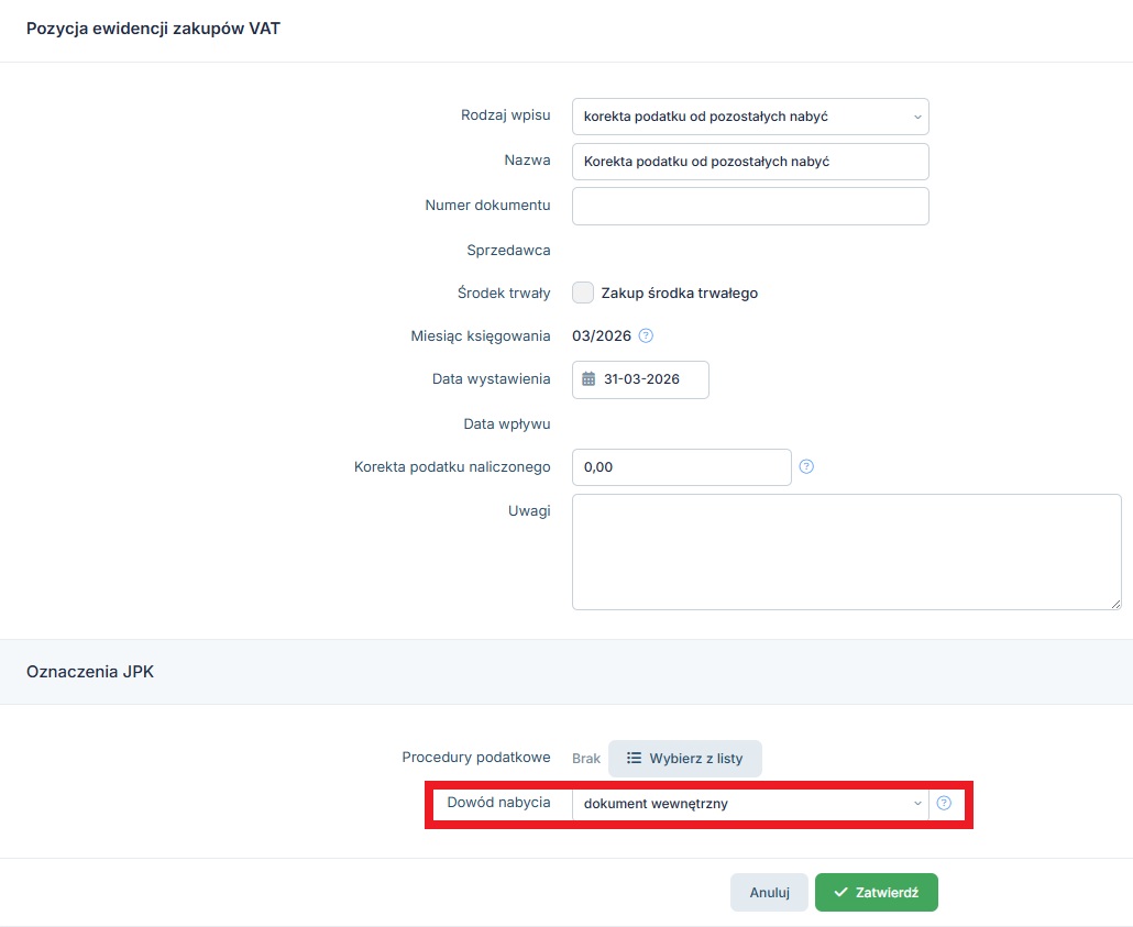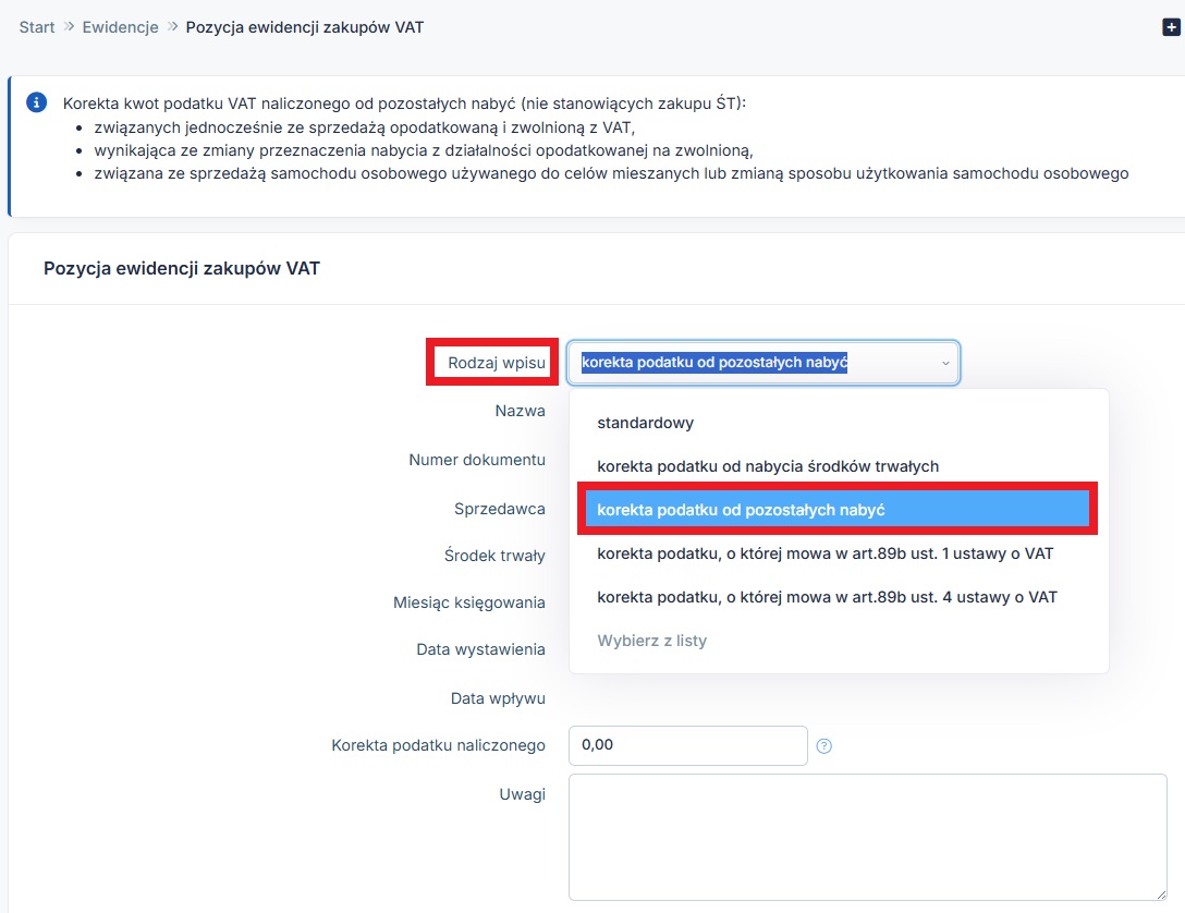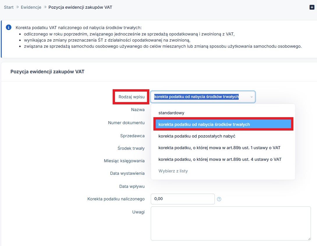 Sposób wprowadzenia korekty, odbywa się przez zakładkę Księgowość ➡ Ewidencje ➡ Ewidencja zakupów VAT ➡ Dodaj pozycję ewidencji zakupów VAT.