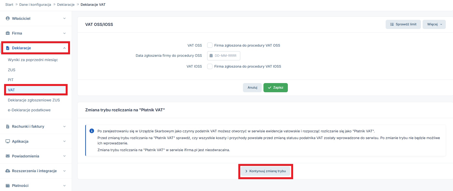 Po lewej stronie należy wybrać Deklaracje ➡ VAT ➡ w części Zmiana trybu rozliczenia na Płatnik VAT ➡ kontynuuj zmianę trybu.