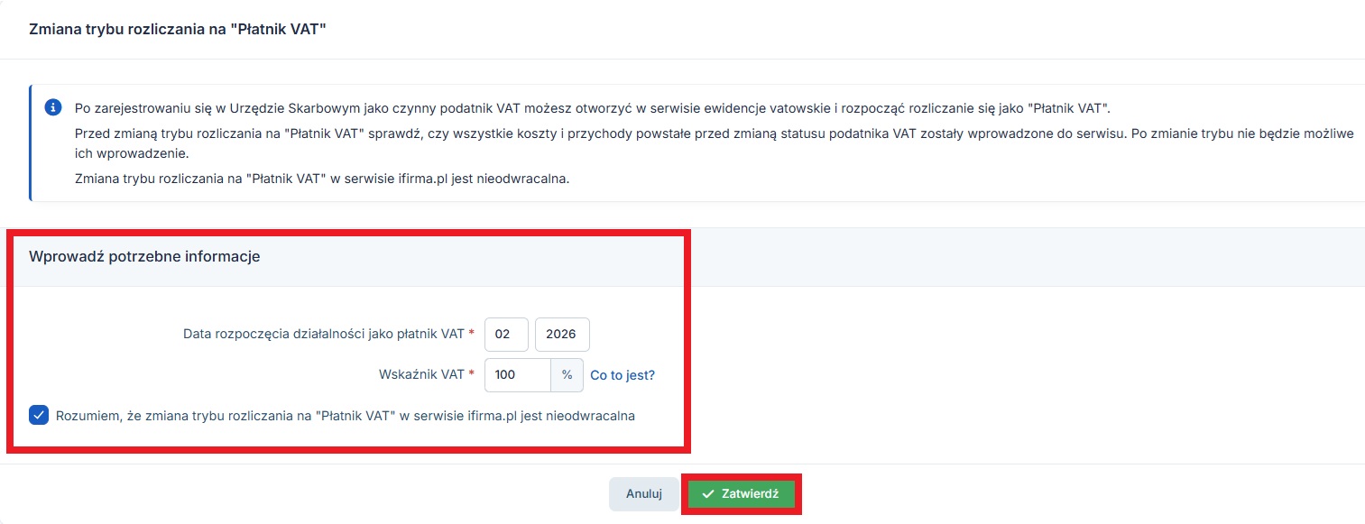 Zgodnie z komunikatem, zmiana trybu rozliczania na “Płatnik VAT” w serwisie jest nieodwracalna. Nie można tej czynności cofnąć. Jeśli konto zostało przekształcone nieprawidłowo lub od złego miesiąca, należy skontaktować się z BOK serwisu IFIRMA.
