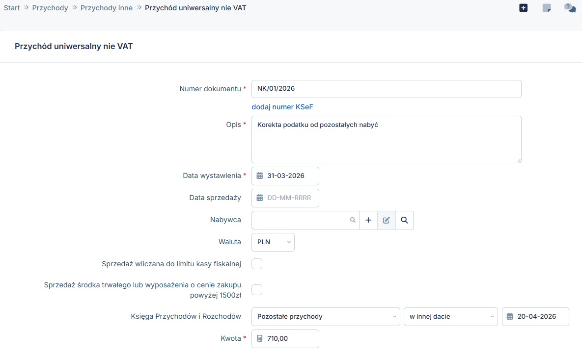 Sposób wprowadzenia przychodu jest przez zakładkę Sprzedaż ➡ Faktury ➡ Inne przychody ➡ Przychód uniwersalny nieVAT.
