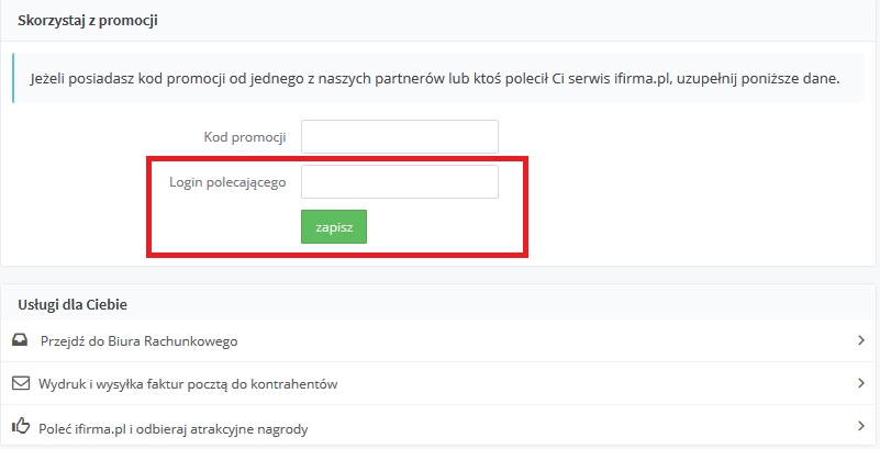 Klient któremu został polecony serwis ma 30 dni na wpisanie kodu rabatowego w zakładce Login ➡ Zarabiaj z ifirma.pl