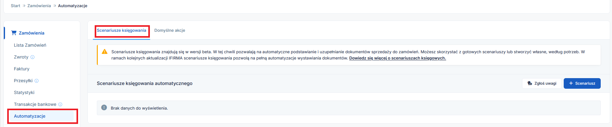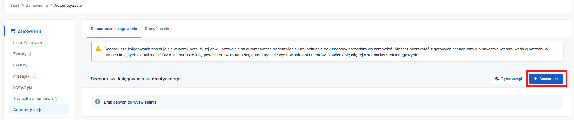 Przejdź do zakładki: E-commerce ➡ Zamówienia ➡ Automatyzacje ➡ Scenariusze księgowania