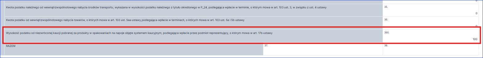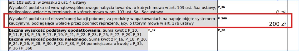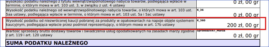 Wprowadzony zapis dotyczący podatku należnego od niezwróconych opakowań widoczny będzie w deklaracji JPKV7 w polu 360 – Wysokość podatku od niezwróconej kaucji pobranej za produkty w opakowaniach na napoje objęte systemem kaucyjnym, podlegająca wpłacie przez podmiot reprezentujący, o którym mowa w art. 17b ustawy.