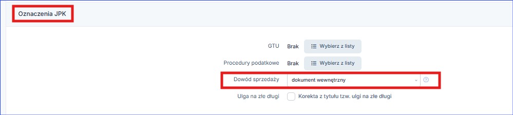 W części Oznaczenia JPK należy wybrać w polu Dowód sprzedaży ➡ dokument wewnętrzny.