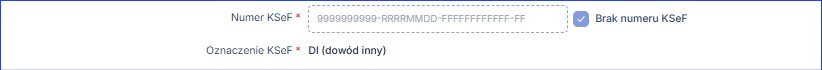 Numer KSeF jest automatycznie zaznaczony jako Brak numeru KSeF z oznaczeniem DI (dowód inny).