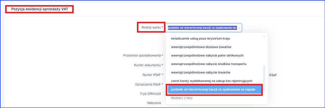 W polu Rodzaj wpisu wybieramy podatek od niezwróconej kaucji za opakowania na napoje po jego wybraniu pojawi się dodatkowy zapis Wysokość podatku od niezwróconej kaucji pobranej za produkty w opakowaniach na napoje objęte systemem kaucyjnym podlegająca wpłacie w terminie określonym w art. 103 ust. 5da ustawy o VAT.