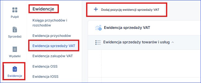 W zakładce Księgowość ➡ Ewidencje ➡ Ewidencja sprzedaży VAT wybieramy opcję +Dodaj ewidencję sprzedaży VAT.