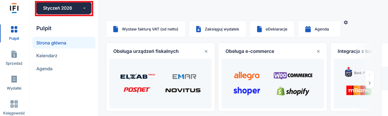 W celu obsłużenia umowy powołania w systemie w pierwszej kolejności należy sprawdzić czy znajdujemy się we właściwym miesiącu rozliczeniowym. Informacja widoczna jest po zalogowaniu się do programu w lewym górnym rogu.