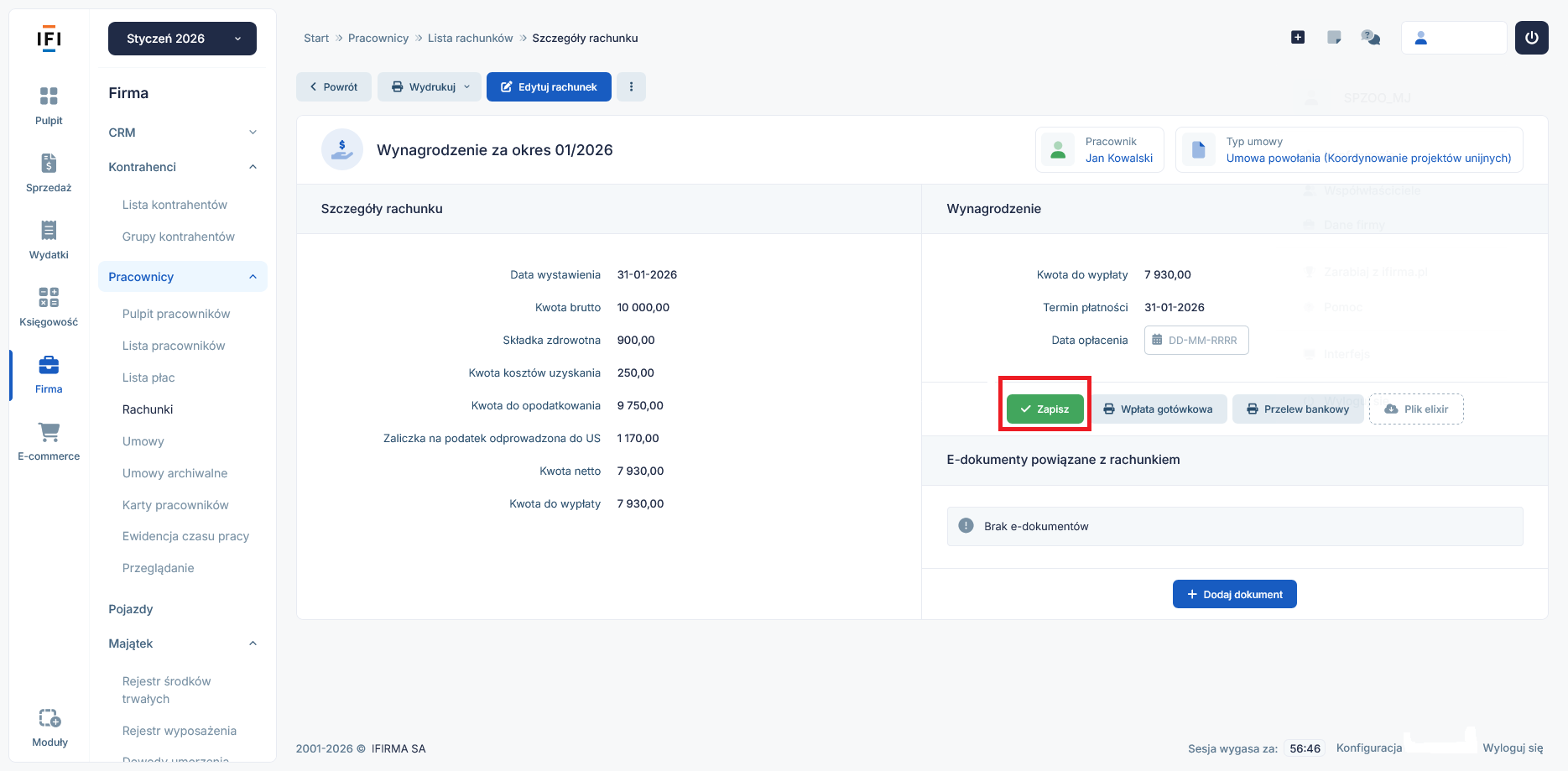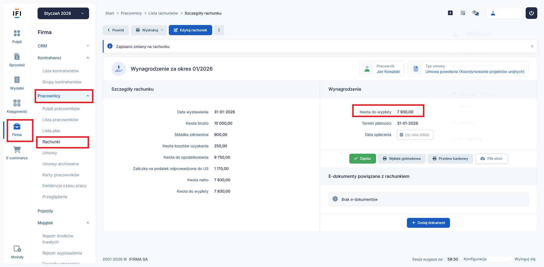 Po zatwierdzeniu rachunku system automatycznie wyliczy kwotę netto do wypłaty. Pamiętajmy, że jeśli pracownik zrezygnuje ze złożenia PIT-2 kwota wolna od podatku nie zostanie rozliczona. Taka sytuacja występuje w naszym przypadku. Kwota netto do wypłaty będzie widoczna po przejściu ścieżki dostępu: Firma → Pracownicy → Rachunki.