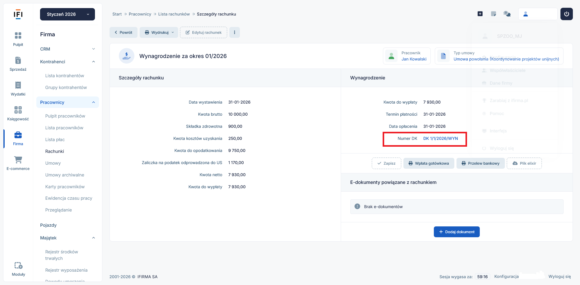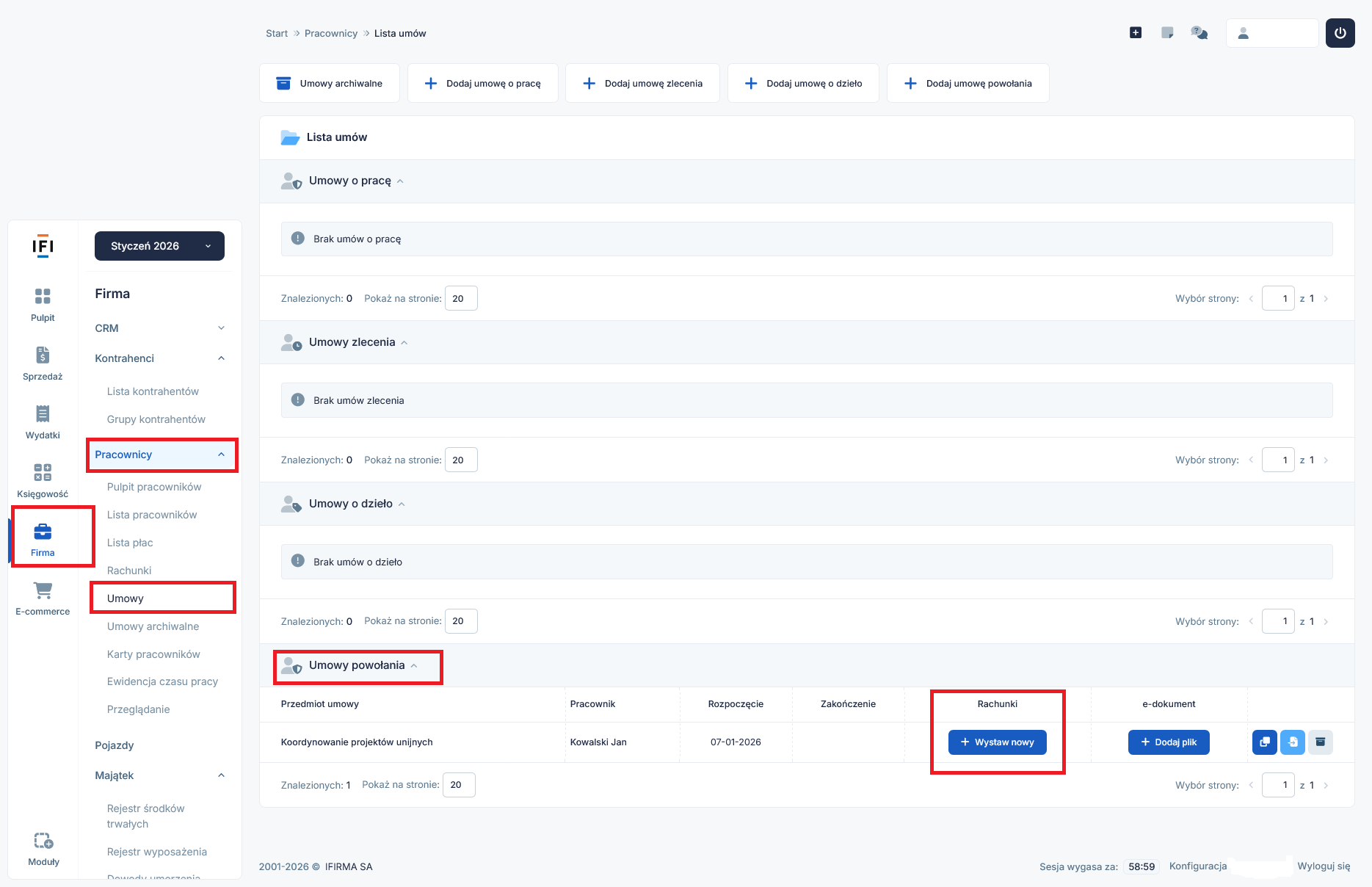 Rachunek do umowy powołania co do zasady powinien wystawić podmiot wykonujący tę umowę. Taki rachunek można wystawić w systemie przechodząc do zakładki Firma → Pracownicy → Umowy → Umowy powołania → Rachunki → Wystaw nowy.