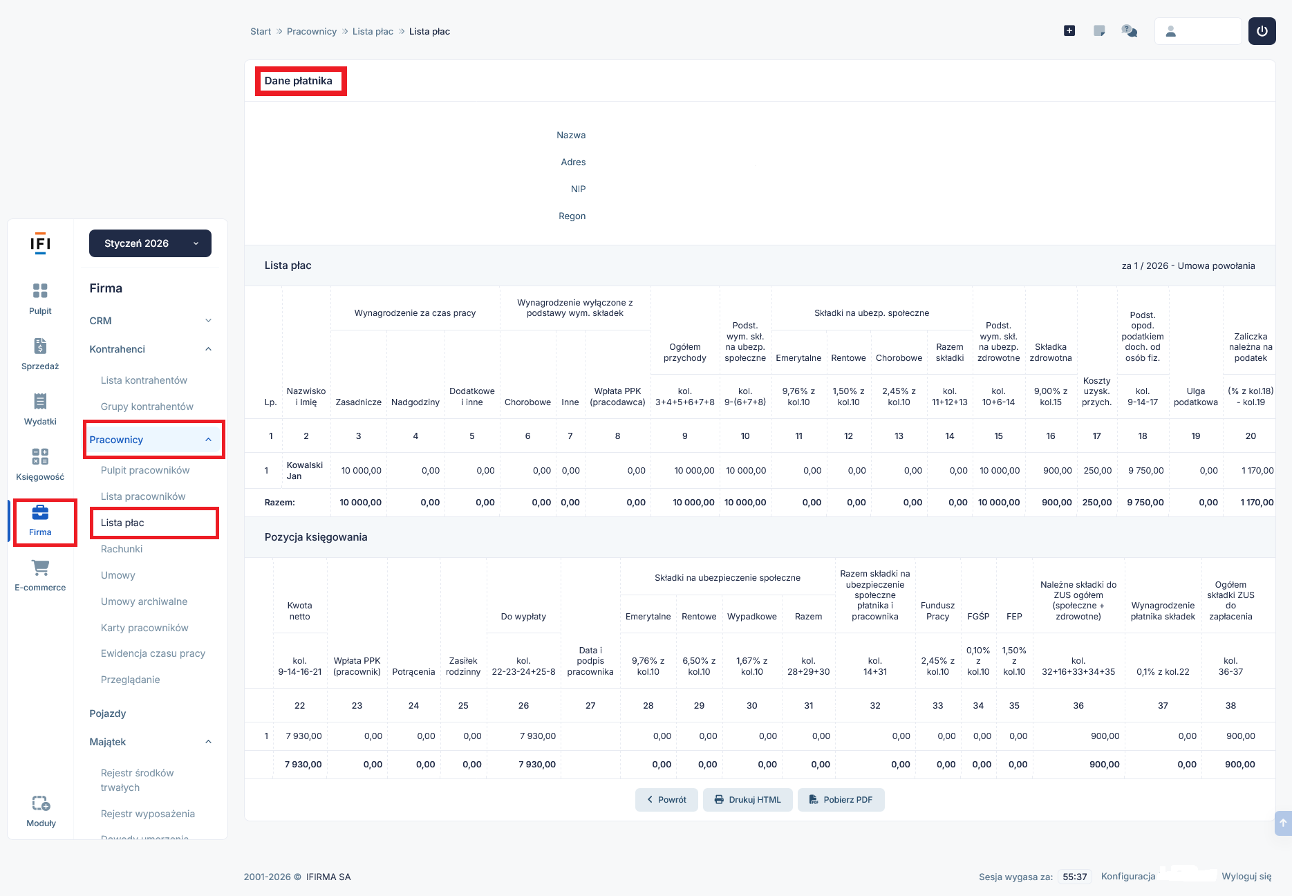 Na podstawie wcześniej przeprowadzonych czynności system wygeneruje listę płac, na której pojawią się szczegółowe wyliczenia dotyczące podatku i składek ZUS.