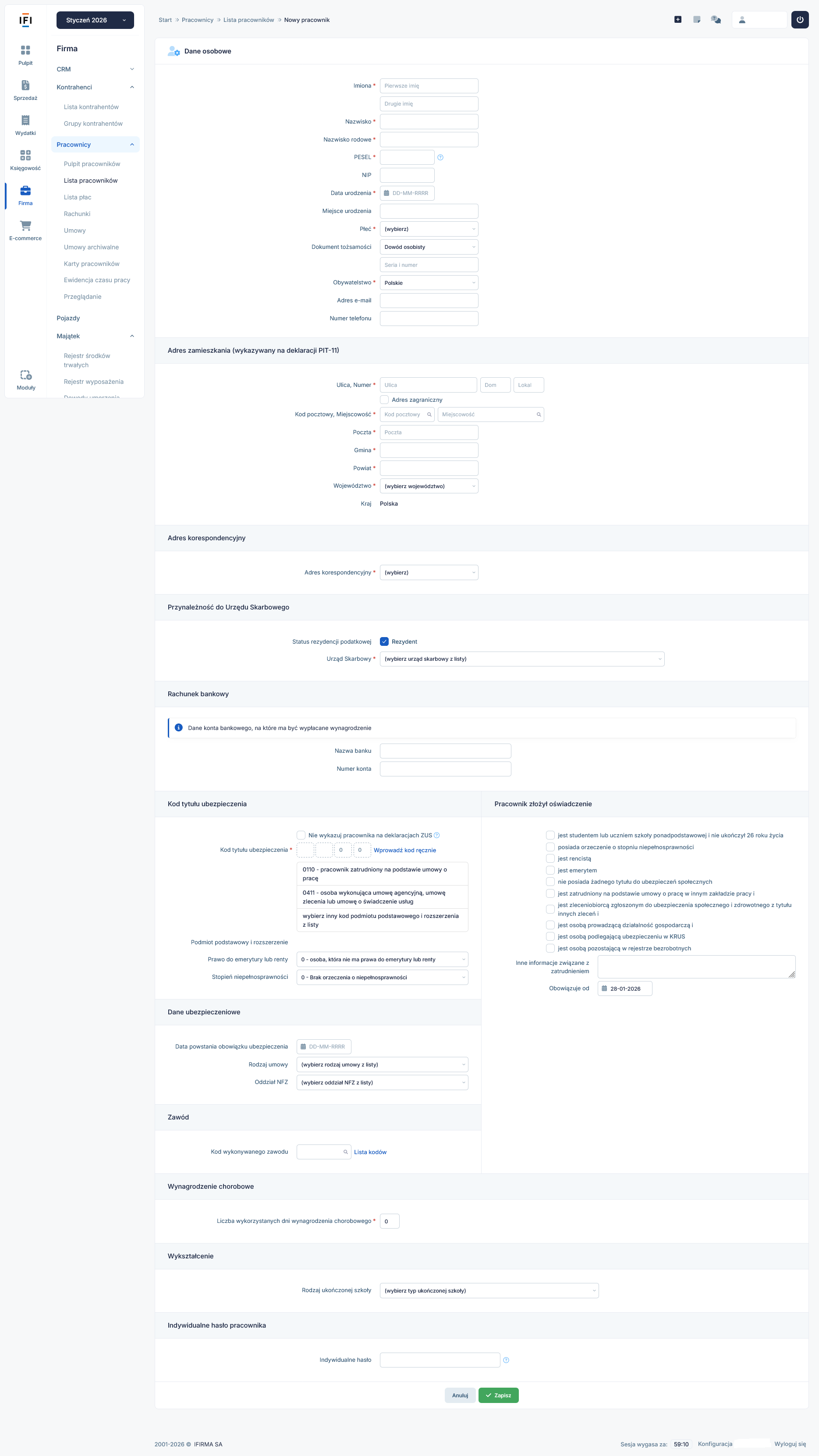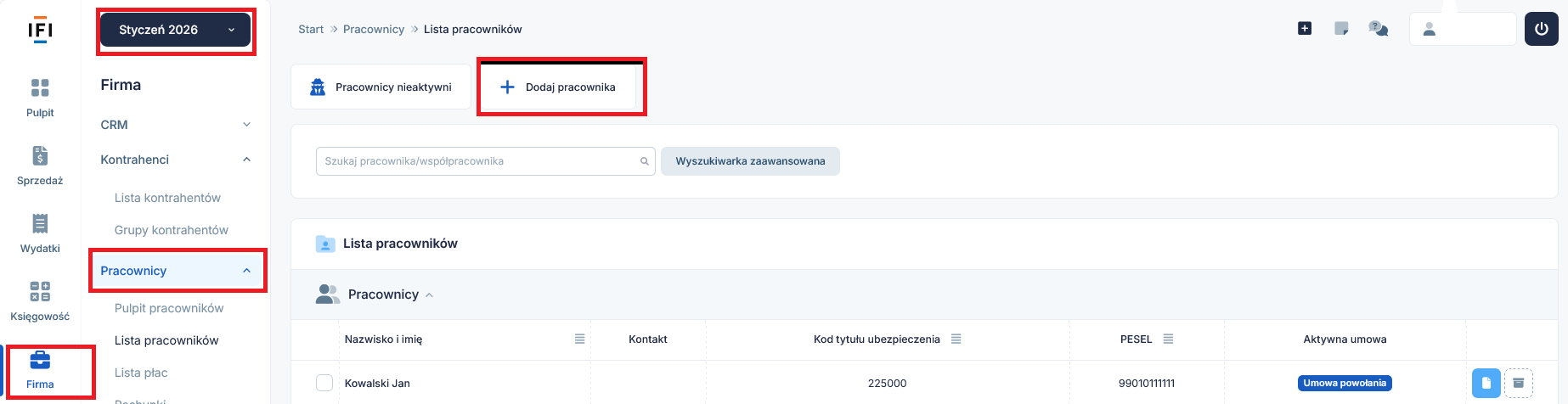 Jeśli nie mamy jeszcze zarejestrowanego pracownika w systemie, to przechodzimy do zakładki Firma → Pracownicy → Dodaj pracownika.