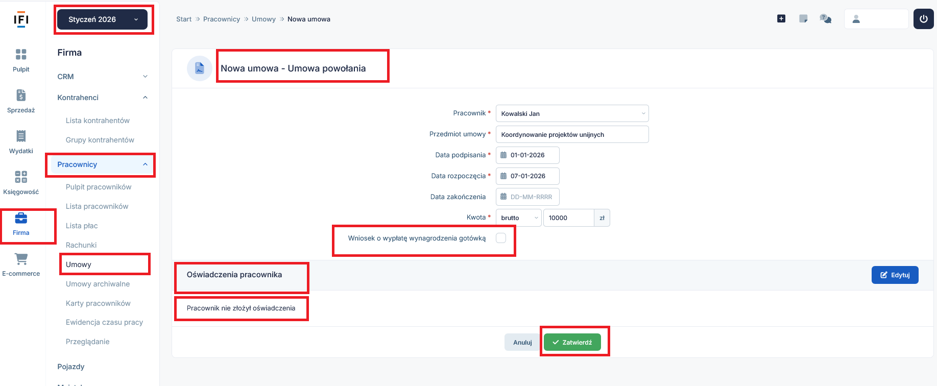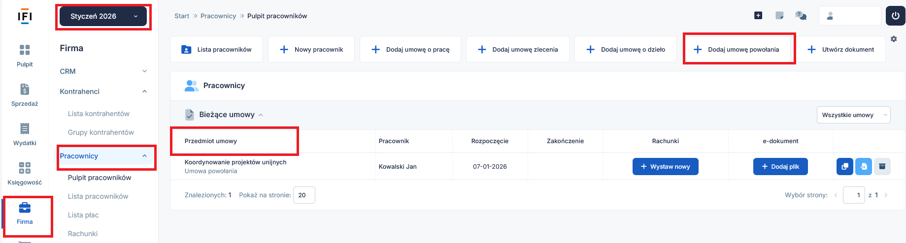 Po wprowadzeniu pracownika dokonujemy rejestracji umowy powołania. W tym celu wchodzimy w zakładkę Firma → Pracownicy → Umowy → Dodaj umowę powołania.