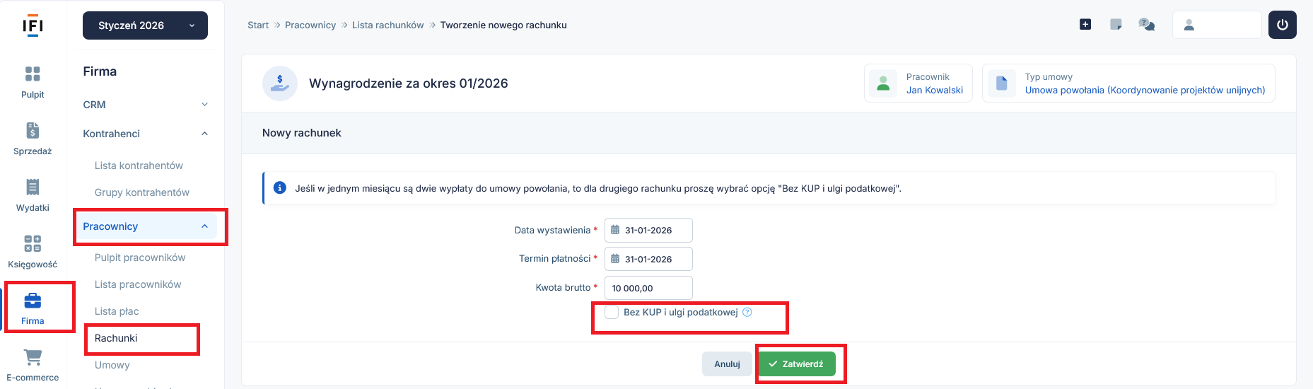 Przy wystawianiu rachunku pojawia się komunikat o odliczaniu pracowniczych kosztów uzyskania przychodów i uldze podatkowej, która przysługuje tylko raz w miesiącu. Jeśli więc osoba powołana będzie miała więcej tytułów do rozliczania wynagrodzeń, to powinna zaznaczyć checkbox “Bez KUP i ulgi podatkowej”.