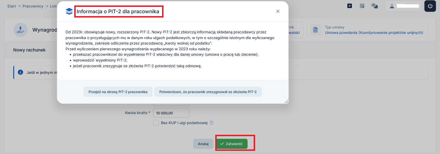 Na etapie zatwierdzania rachunku pojawia się informacja przypominająca o roli informacji przekazanych w oświadczeniu PIT-2. W tym miejscu można jeszcze uzupełnić te dane lub potwierdzić, że pracownik zrezygnował ze złożenia PIT-2.