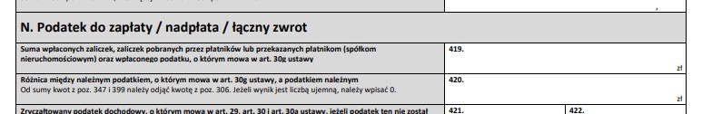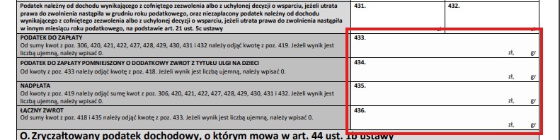 7) W polach 433 wykazany zostanie podatek podlegający zapłacie, natomiast w polu 435 nadpłata podatku