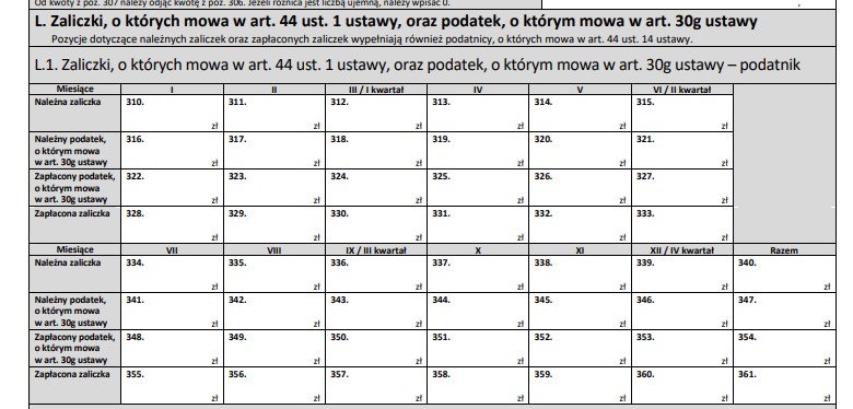 5) W części L należy uzupełnić zaliczki należne i faktycznie zapłacone.