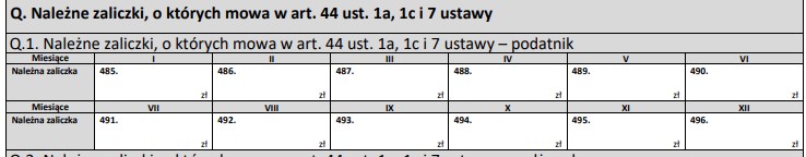 6) Część Q, dotyczącą zaliczek należnych za poszczególne miesiące/kwartały w roku, przy uproszczonych zaliczkach pozostawia się pustą.