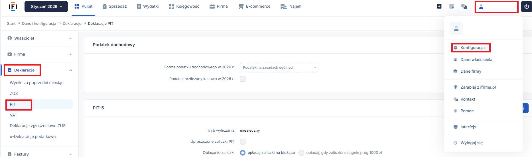 Aby system IFIRMA odpowiednio liczył zaliczki uproszczone należy przejść do konfiguracji, a następnie wybrać zakładkę Deklaracje ➡ PIT