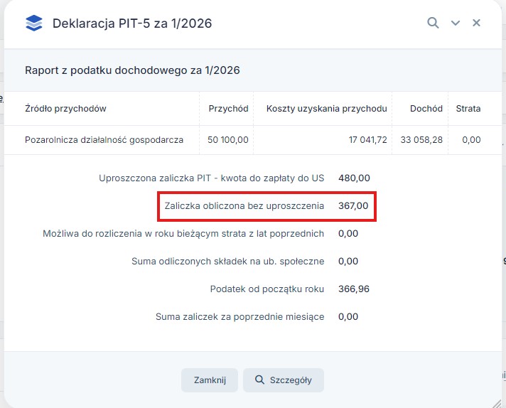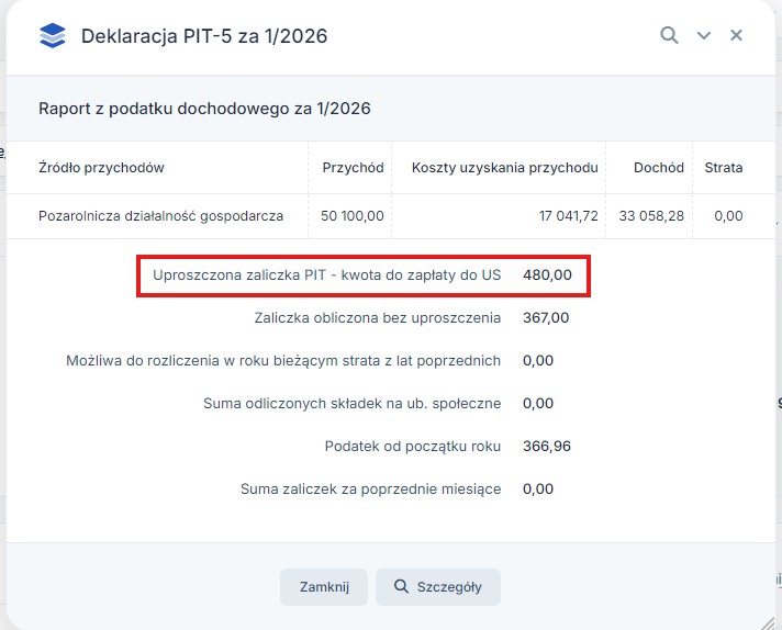 Po wygenerowaniu PIT-5 w Raporcie z podatku dochodowego będzie widoczna wysokość zaliczki uproszczonej 480 zł (bez względu na osiągnięty dochód)
