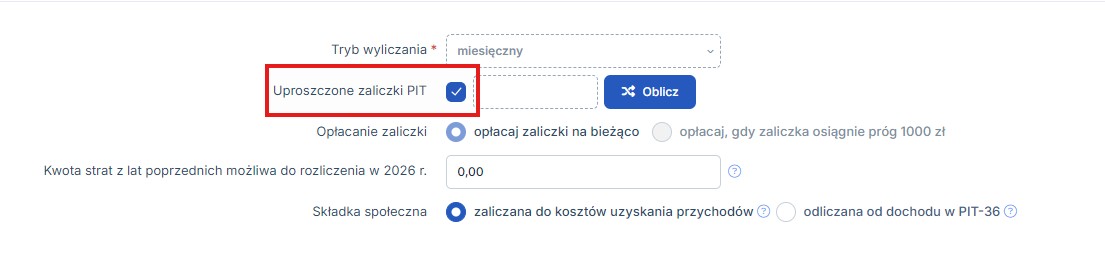 oraz zaznaczyć checkbox Uproszczone zaliczki PIT: