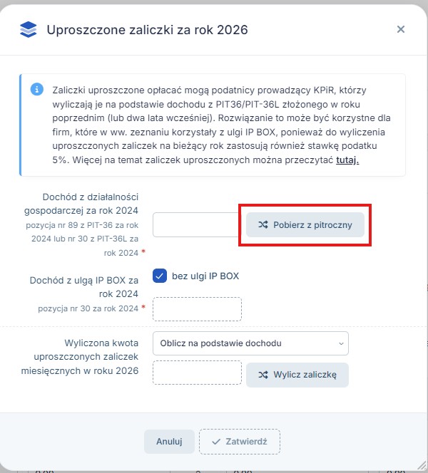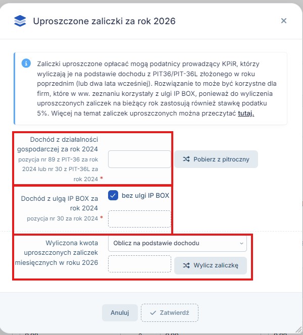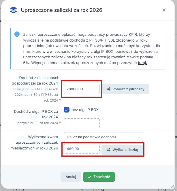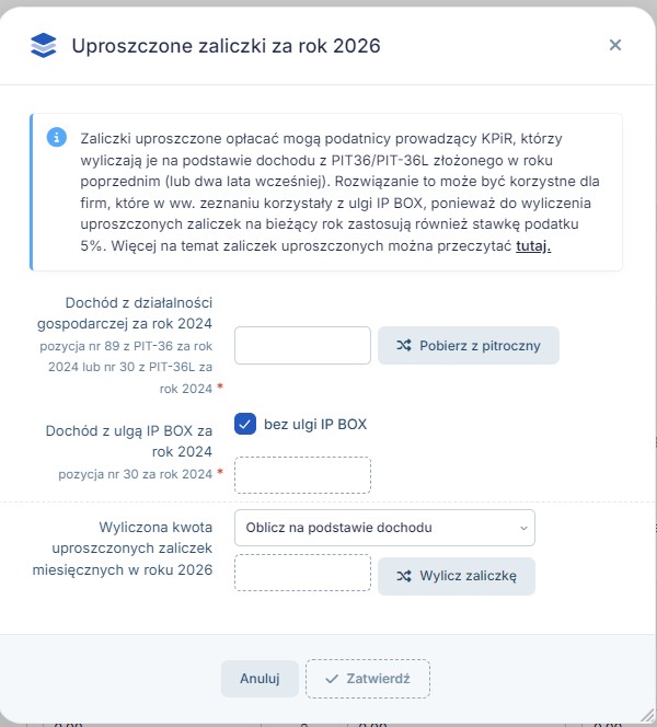 System daje możliwość wyliczenia uproszczonych zaliczek, w tym celu należy uzupełnić pole Dochód z działalności gospodarczej za rok a w przypadku rozliczania ulgi IP BOX również Dochód z ulgą IP BOX za rok, a w polu Wyliczona kwota uproszczonych zaliczek miesięcznych w roku należy wybrać Oblicz na podstawie dochodu: