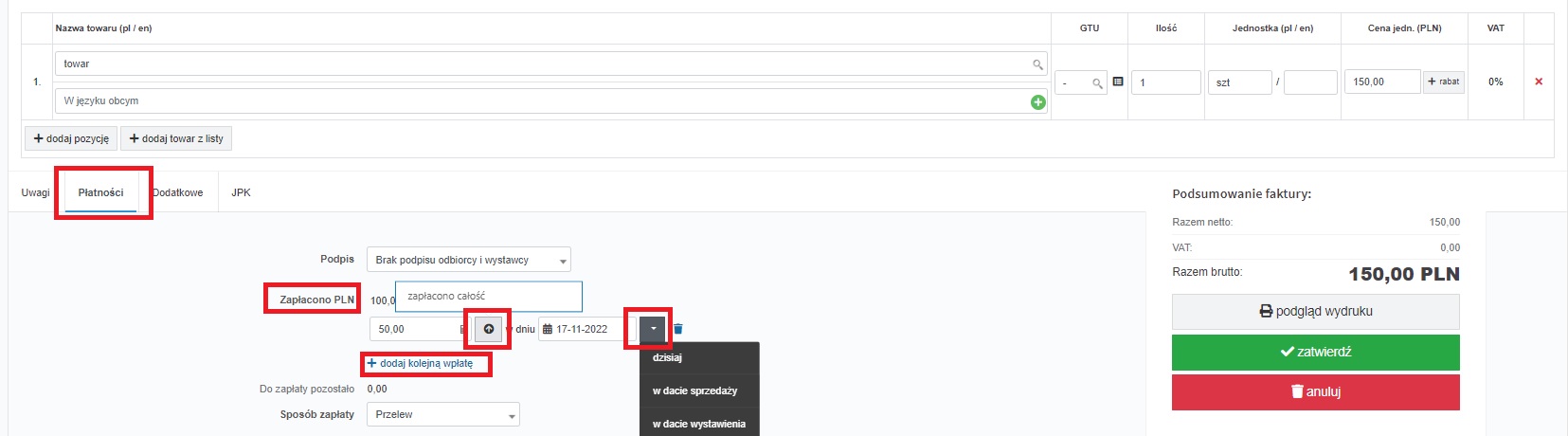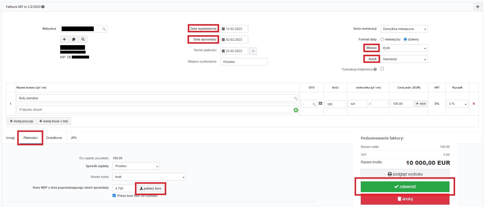 W formularzu sprzedawca uzupełnia właściwą datę wystawienia i datę sprzedaży, wybiera walutę oraz pobiera kurs. Jako kurs do przeliczenia wartości sprzedaży – zarówno do celów podatku dochodowego jak i VAT pobrany zostanie średni kurs NBP z ostatniego dnia roboczego poprzedzającego datę sprzedaży (zgodnie z przyjętymi w serwisie założeniami dotyczącymi stosowania kursów właściwych dla celów podatku dochodowego).