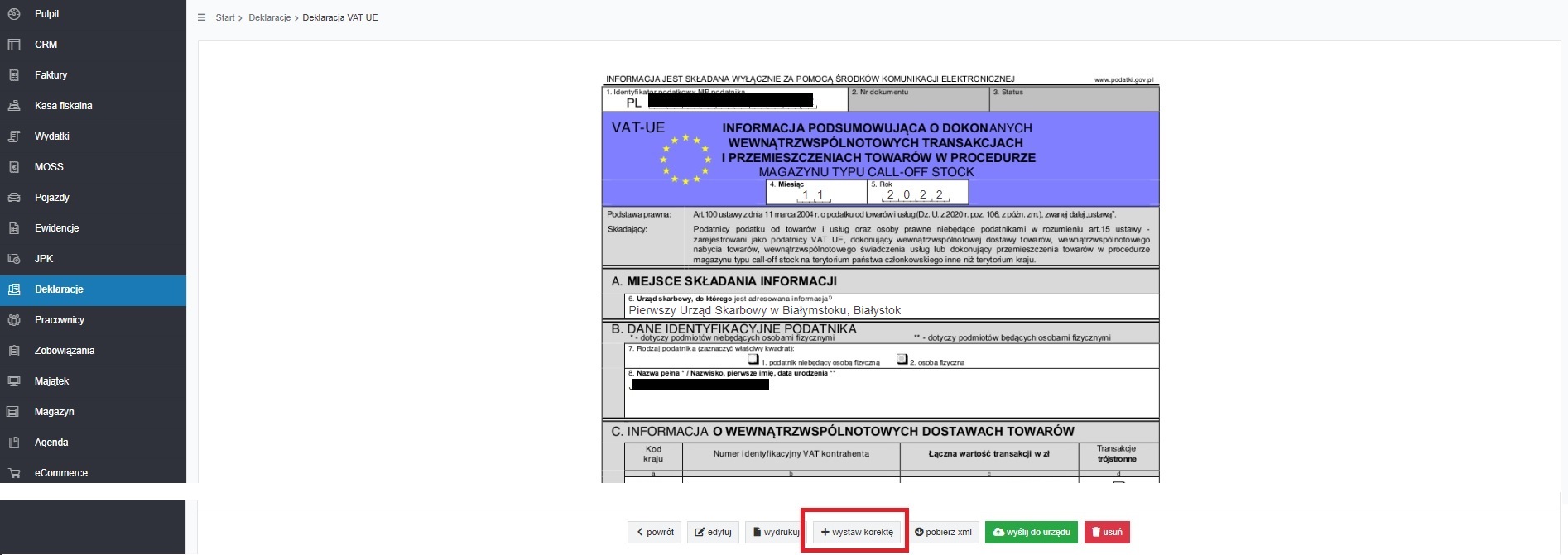 W polu dotyczącym zakresu korekty należy zaznaczyć zarówno ewidencje jak i deklaracje.