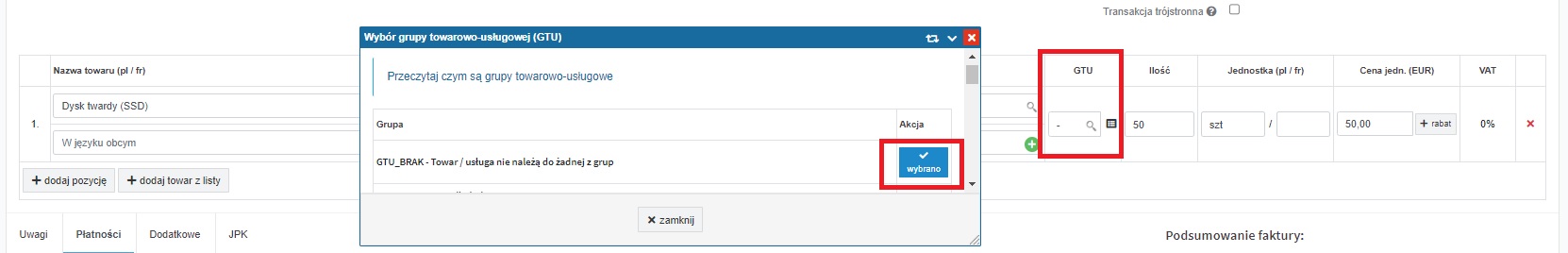 • plik JPK_V7M za za wrzesień – w części ewidencyjnej w polu K_21 na kwotę 11 171 zł, oraz w deklaracyjnej w polu P_21. Ujęta w części ewidencyjnej faktura nie zawiera oznaczenia o zastosowaniu kodu GTU.