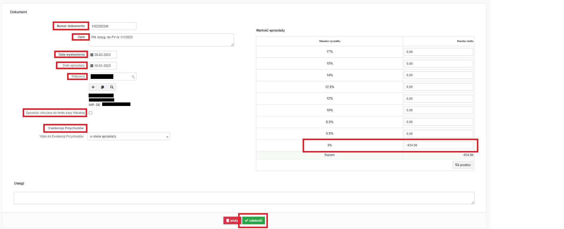 • kwota: wartość zmniejszenia przychodu – 934,96 zł, kwota ze znakiem minus przy stawce 3%