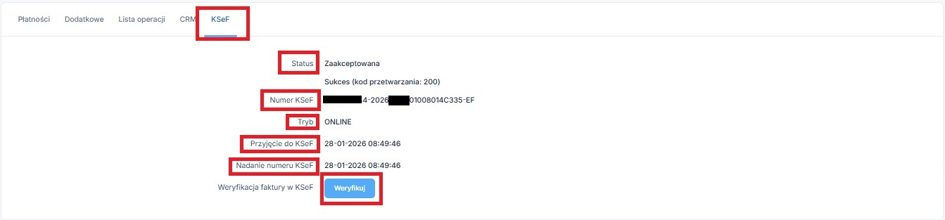 Na karcie KSeF możliwe jest sprawdzenie statusu faktury, uzyskanego przez nią nr KSeF, daty jej przesłania do KSeF i przyjęcia w KSeF. Dodatkowo zostanie wyświetlona informacja w jakim trybie została wystawiona faktura.