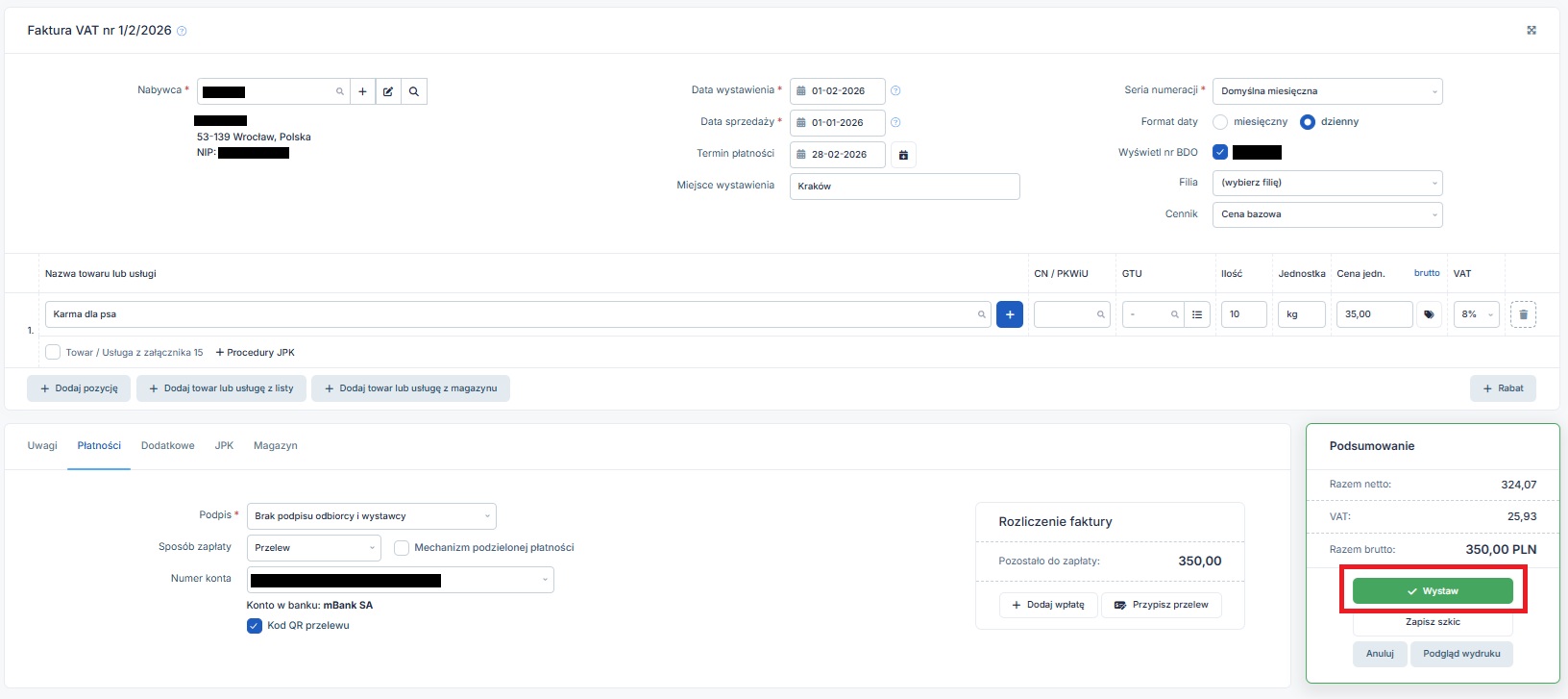 Po uzupełnieniu danych faktury należy wybrać opcję Wystaw.