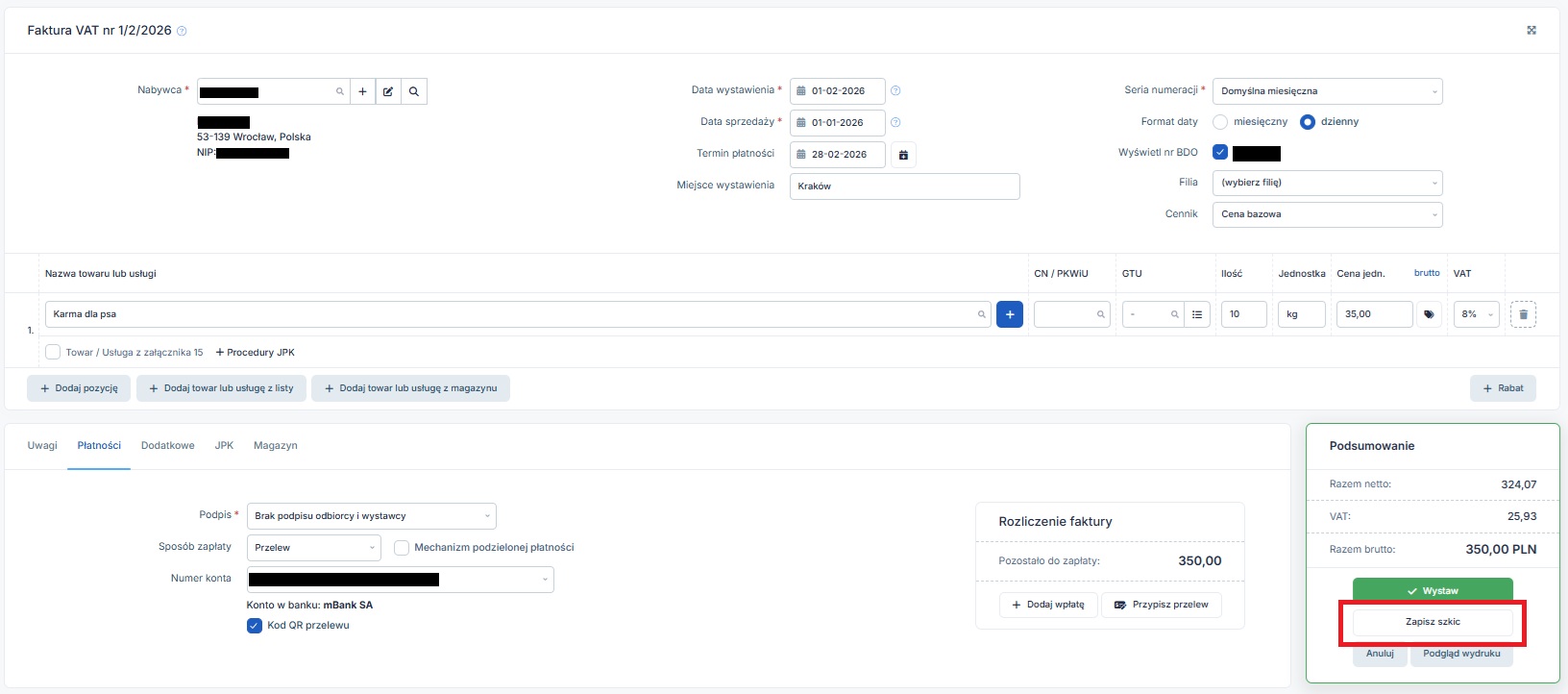 Spowoduje on zapisanie dokumentu. W przypadku, kiedy chcemy zapisać wprowadzone dane ale bez wystawienia faktury możliwe jest skorzystanie z funkcji Zapisz szkic.