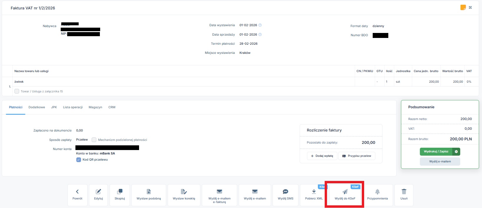 Wystawiony dokument będzie zgodny z obowiązującą od lutego 2026 r. strukturą faktury ustrukturyzowanej (FA(3)). W związku z tym, iż dla danego dokumentu przedsiębiorca może korzystać z możliwości jego nie wysyłania do KSeF, zatwierdzona faktura nie zostanie przesłana automatycznie.