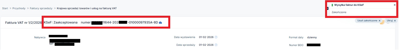 W prawym górnym rogu widoczny będzie status operacji związanych z wysyłką do KSeF.