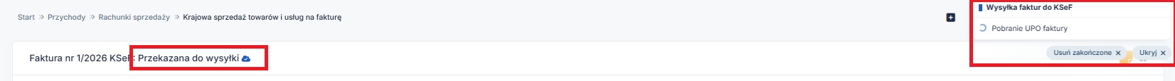 Obecnie UPO dla wysłanych dokumentów można pobrać bezpośrednio ze strony KSeF. Weryfikacja statusu wysyłki dokumentu po stronie serwisu dostępna jest w szczegółach faktury na karcie KSeF.
