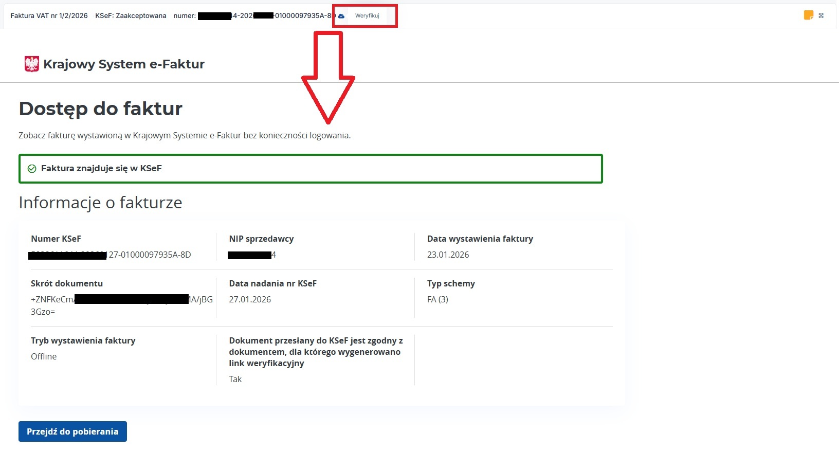 Dodatkowo po wybraniu funkcji Weryfikuj Użytkownik zostanie przeniesiony do strony MF z informacją o tym, iż dokument znajduje się w KSeF.