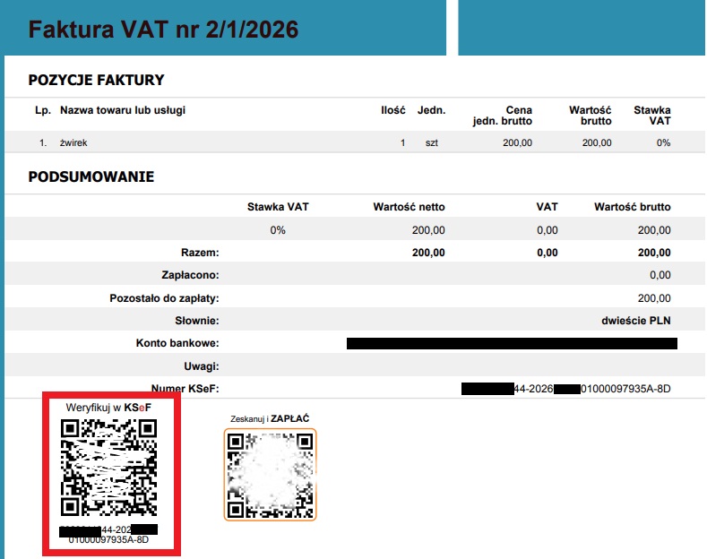 Kodem QR zostanie również oznaczona faktura przesłana do KSeF w przypadku jej użycia (np. pobrania jako wydruk pdf) poza KSeF.