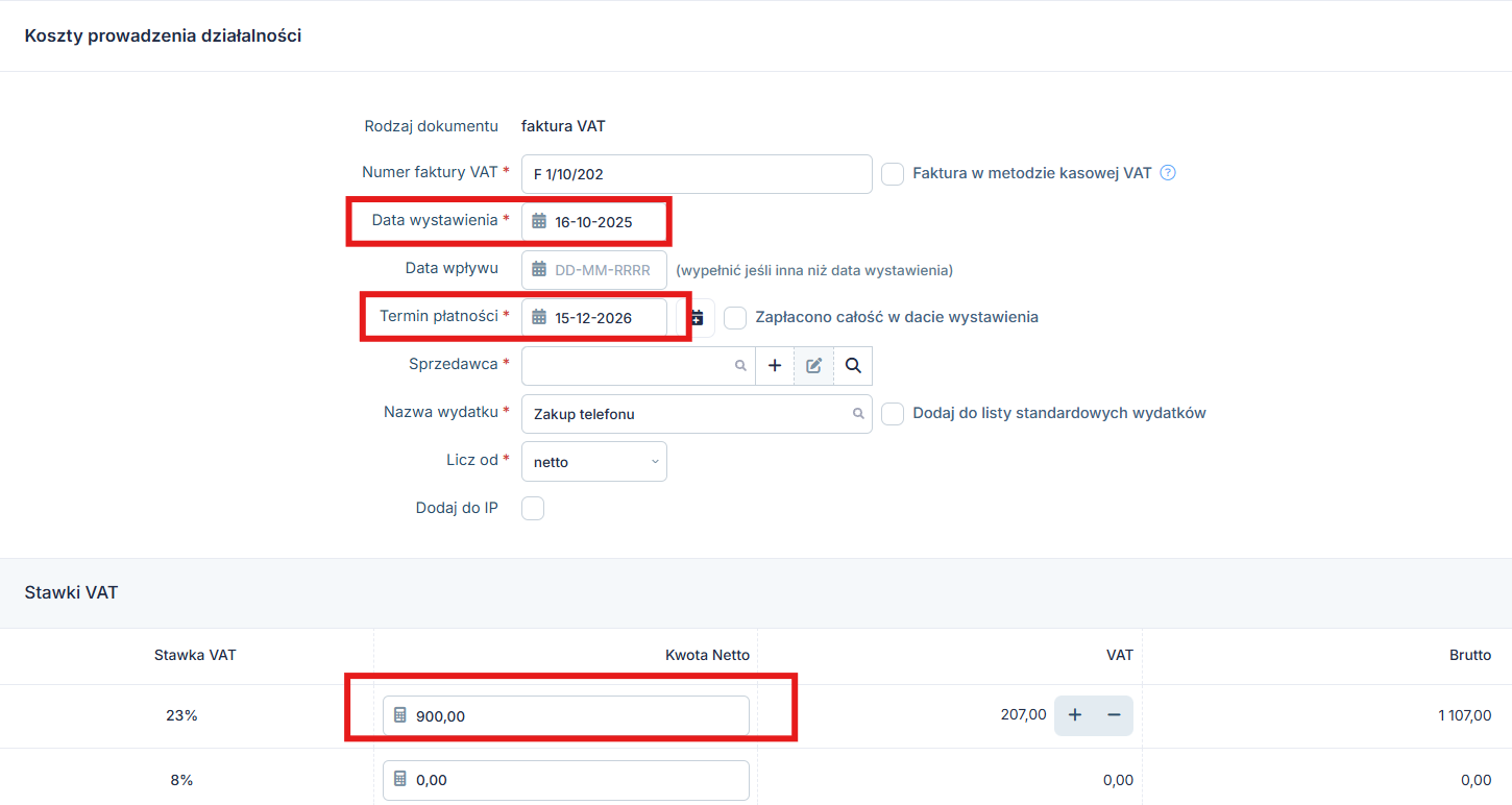 Księgowany w ten sposób wydatek zostanie ujęty w księdze przychodów i rozchodów w wysokości 900 zł w dacie wystawienia faktury, a podatek VAT zostanie rozliczony w ewidencji zakupów VAT.