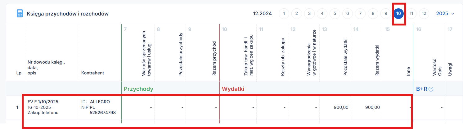 Poniżej widok z zakładki Księgowość ➡ Ewidencje ➡ Księga przychodów i rozchodów.
