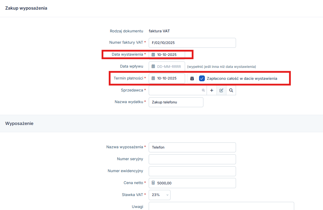 Zakup należy wprowadzić w zakładce Firma ➡ Majątek ➡ Rejestr wyposażenia ➡ Dodaj wyposażenie ➡ Zakup wyposażenia na fakturę VAT. Dokument można oznaczyć jako opłacony w całości w dacie wystawienia.