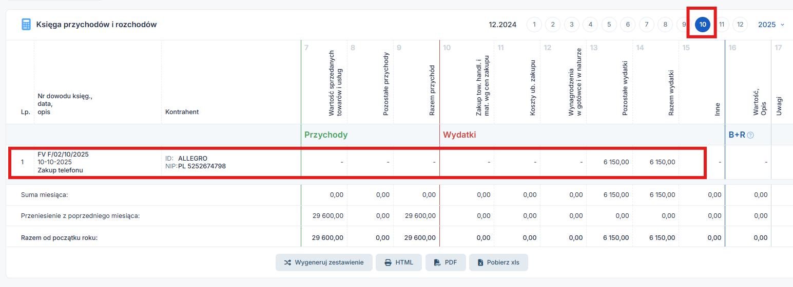 Koszt został rozliczony w październiku w wysokości 600 zł w księdze przychodów i rozchodów; podatek VAT został odliczony w ewidencji zakupów VAT.