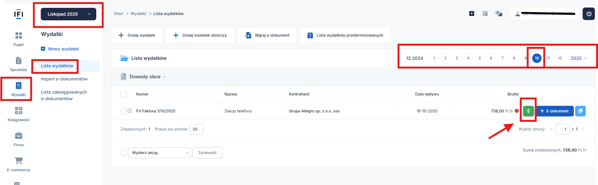 Należy ustawić w lewym górnym rogu miesiąc księgowy listopad – miesiąc zgodny z datą opłacenia. Trzeba przejść do zakładki Wydatki > Dowody obce. Następnie na osi czasu ustawić miesiąc zgodny z datą wystawienia faktury zakupu (wprowadzenia do serwisu wydatku, dla przykładu jest to miesiąc październik) i odnaleźć dokument na liście.