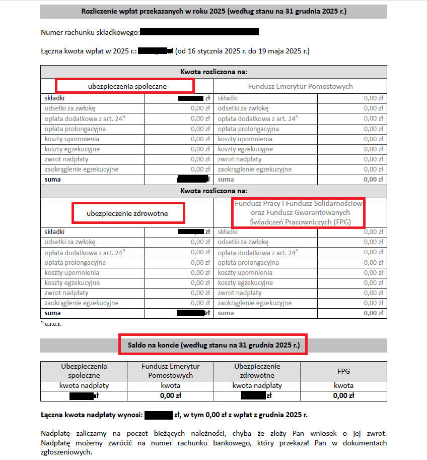 W przesyłanej corocznie informacji dla przedsiębiorców przez ZUS pojawia się zestawienie zbiorcze o stanie konta ubezpieczonego, które może wykazywać zarówno saldo: