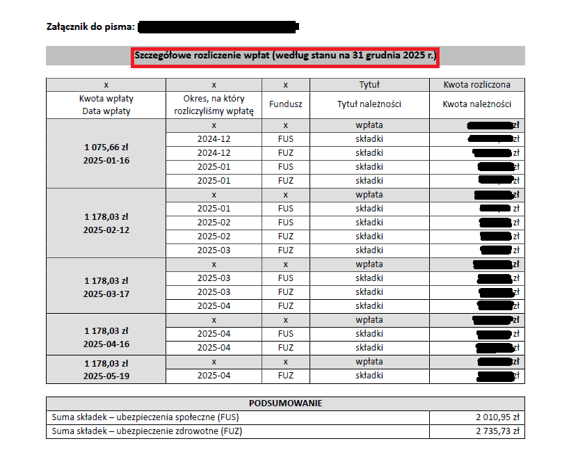 W kolejnym załączniku ZUS pokazuje szczegółowe rozliczenie wpłat z kwotami i datami wpłat w rozbiciu na fundusze, gdzie: